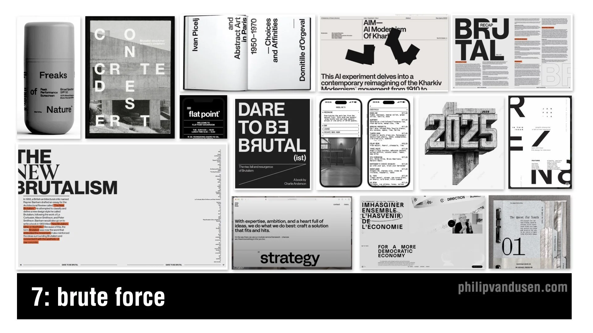 The appeal here is honesty. When so much design is polished and dependent on color and imagery, Brute Force feels grounded, offering the viewer a blunt version of the truth. It has structure, but it has zero pretense.