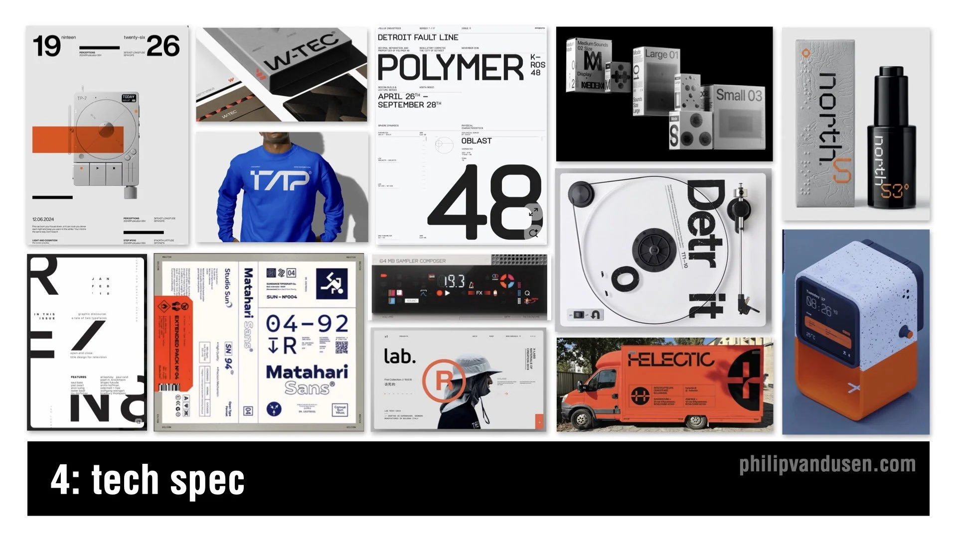 Tech Spec is all about engineered precision. You’ll see wide tracking, strict grids, numeric codes, industrial icons, grayscale palettes, and sharp accent colors. It looks like something from a science lab, a consumer electronics product, or a piece of aerospace equipment.
