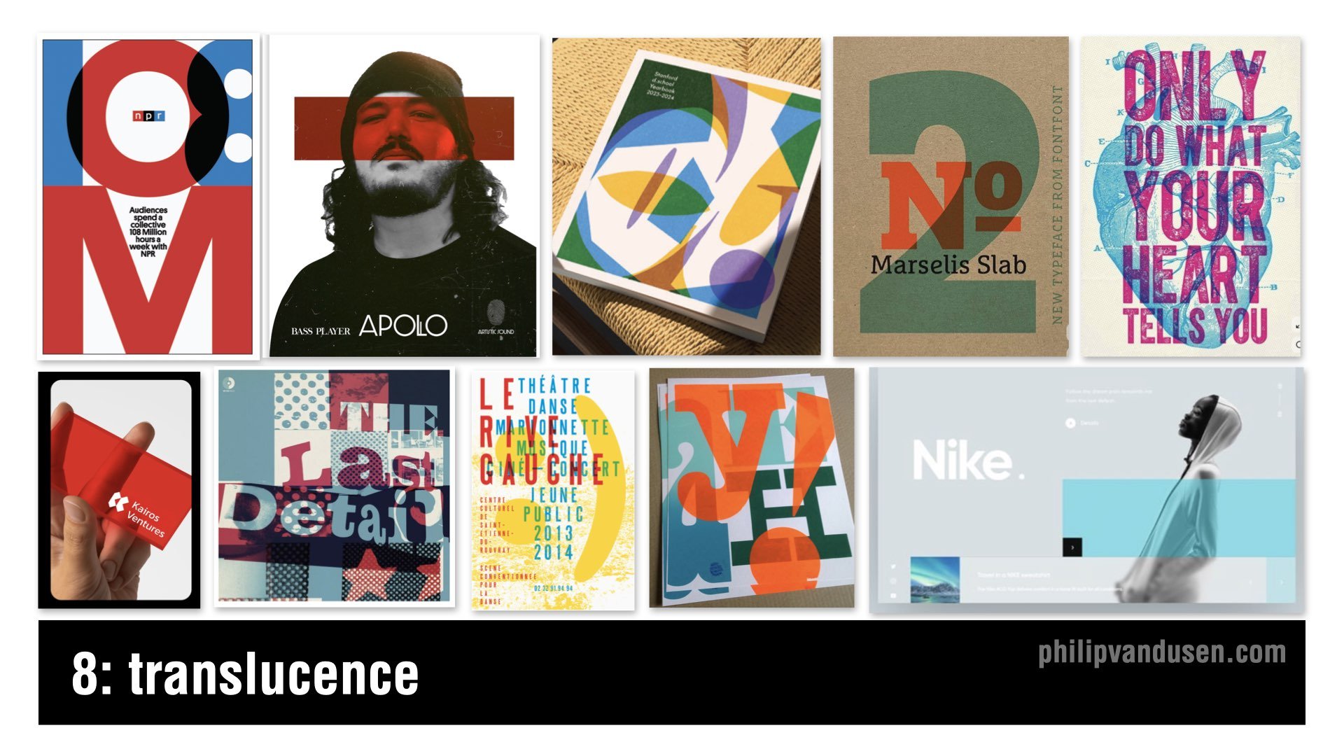 The Translucence trend builds a multi-dimensional world through overlapping transparent layers. This is the graphic design version of vellum or frosted plastic. Designers want to create visual depth without resorting to fully 3D representation. It uses transparency to provide dimension, mood, and compositional complexity all in one.