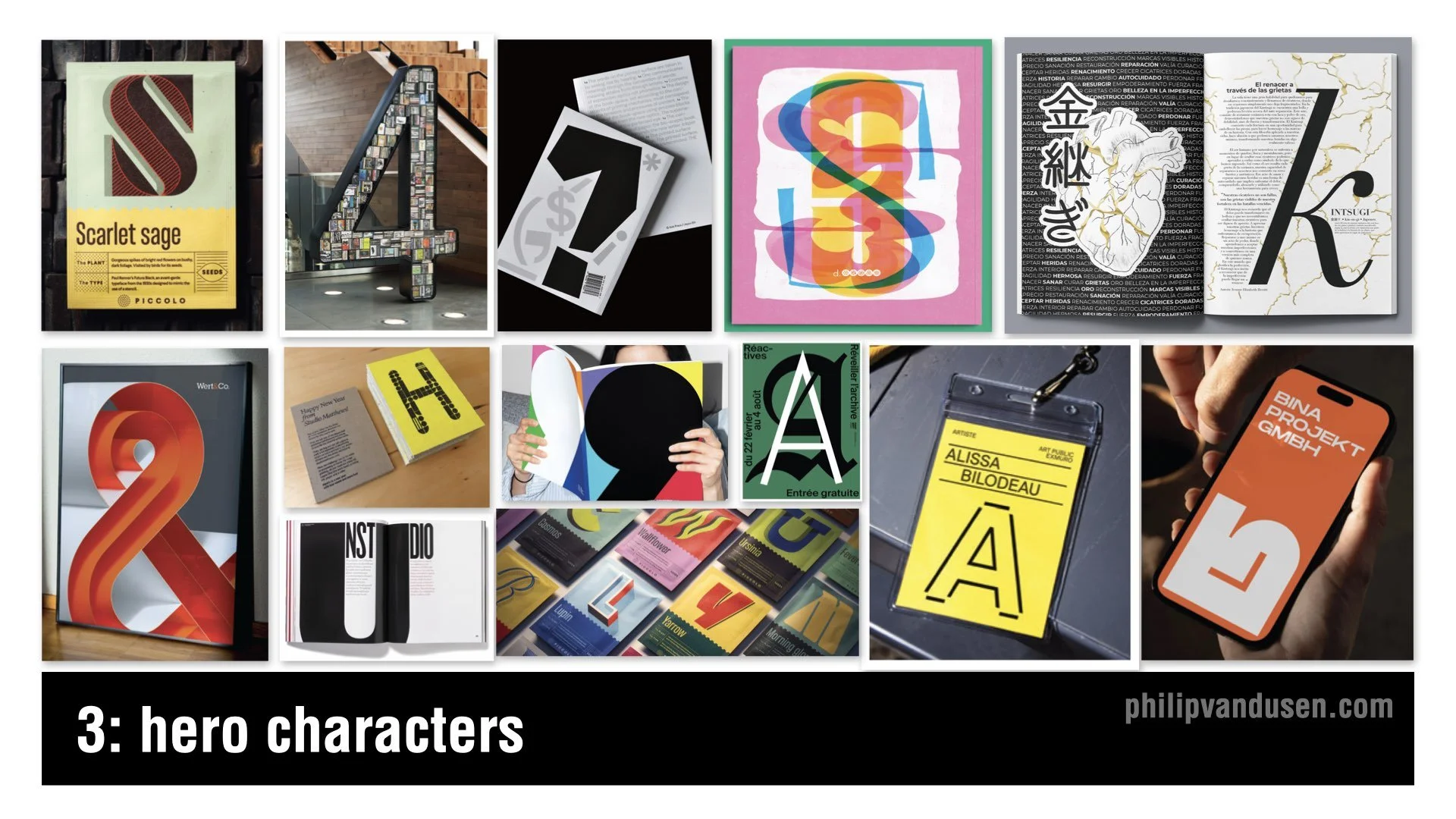 The Hero Characters trend is a celebration of the beauty of a single letter in a font style shown at large scale, dominating layouts so we experience type in a different way. Designers are pulling single letters out of the alphabet and treating them like heroes — letterforms that become dominating sculptural objects.
