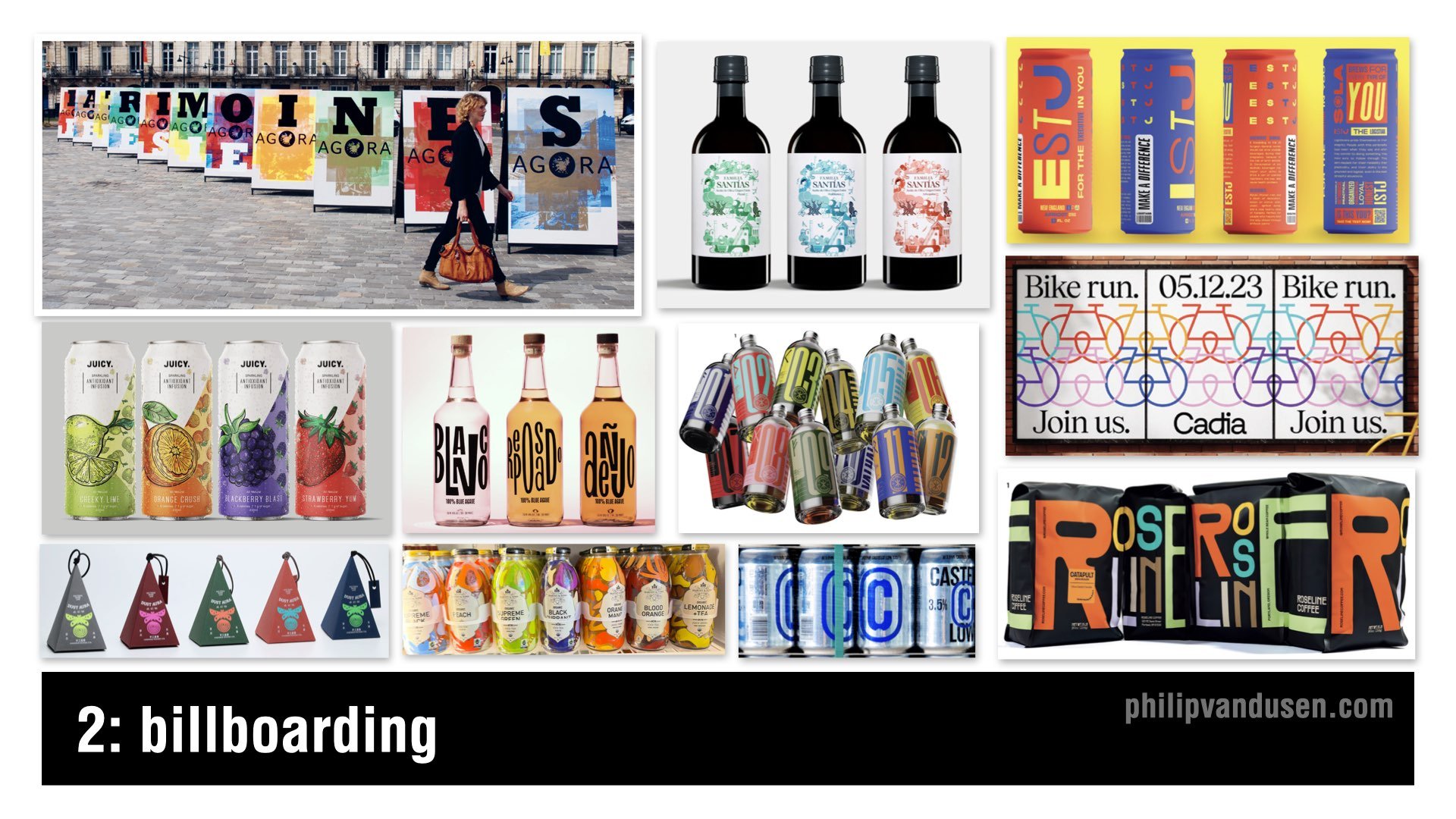 Billboarding is about design in multiples. The designs are variations of each other that relate visually through imagery, color, or illustration style — whatever holds them together as a group.