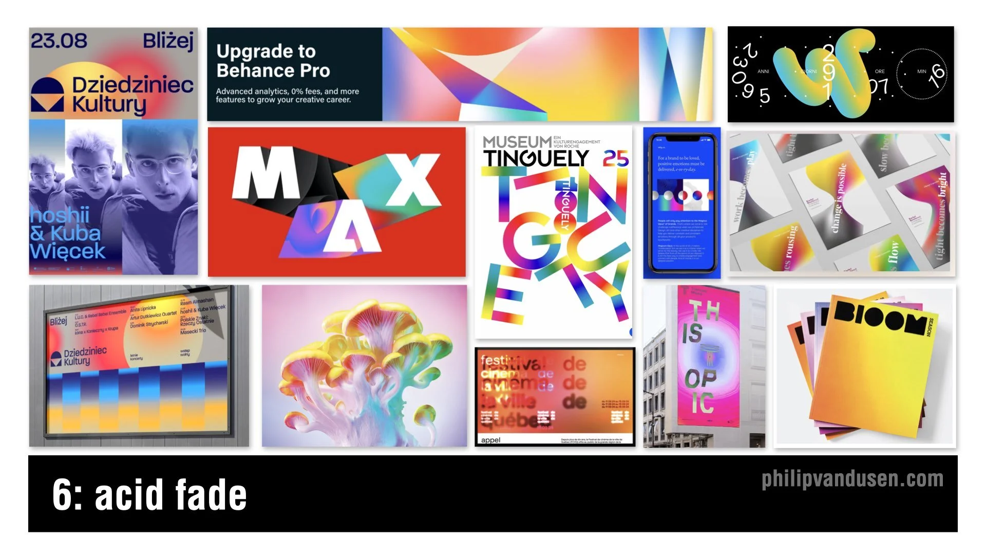 This trend shows up in music events, digital art, tech marketing, Gen-Z packaging, editorial layouts, and motion graphics where gradients feel dynamic and alive. Acid Fade is playful, optimistic, and trippy.