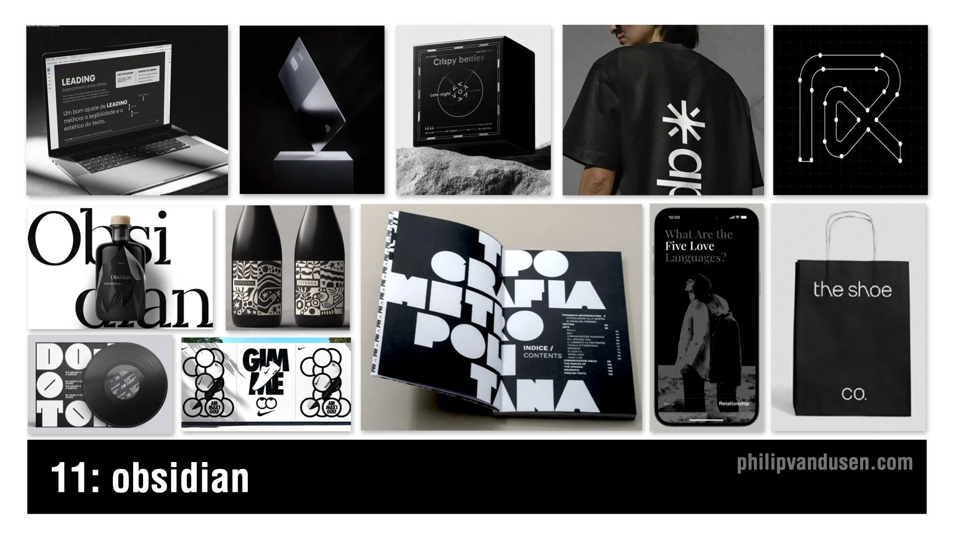 Obsidian is deep, glossy black power dressing for brands. It uses precise typography, minimal color, and dramatic contrast between matte and gloss to create an aura of mystery and luxury.
