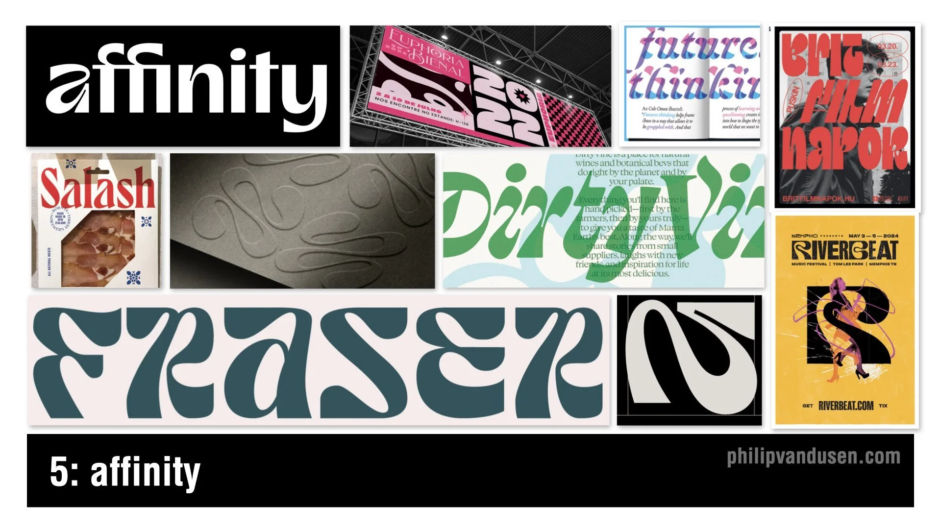 Driven by the identity aesthetic of the design software brand Affinity — often positioned as an “Adobe killer” — the Affinity trend is all about friendly, rhythmic, soft-edged letterforms. Liquid terminals and warm curves juxtaposed with sharper angles create a dichotomy of form that feels decidedly nontraditional. They also come across in a slightly psychedelic way.
